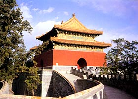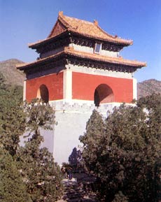 Behind the Hall of Prominent Favor is tomb mound within high castle-like walls, created by piling yellow earth, where the emperor and empress were buried. In front of the castle-like wails stands a small building known as Minglou (Soul Tower), containing at its center a stele inscribed with the posthumous title of the emperor. In front of the Soul Tower is a set of five glazed pottery altar pieces, consisting of two candlesticks, two beakers and an incense burner.