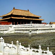 On veranda is a display of musical instruments: bronze bells and a set of jade musical stones. There are month organs, bamboo flutes, and a qin, a zither?like instrument without bridges. Whenever the emperor approached his throne, the bronze bells and the musical stones were sounded, creating in a wonderfully harmonious clatter that was known as shao music. Outside on the terrace, incense was burned in bronze tripods (ding) and cranes. Civil and military officials would kneel on the platform inside by rank. Though fragrant smoke no longer rises from the Hall of Supreme Harmony, everything remains as if the ?Son of Heaven? had just departed.