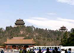 The central summit can be reached via paths on both the eastern and western sides of the hill. In pre-skyscraper days, this was the highest point in Beijing' s Inner City and offered the visitor an unequaled view of the capital and its surroundings. To the north lies the Di' anmen (Gate of Earthly Peace) Street and the lofty Drum Tower at the northern end of the street. Southwest, the viewer takes in the Shicha Lake and Beihai Park. Looking south reveals the entire symmetrical plan of Beijing, with the ancient capital' s principal buildings lined up along its north-south axis.