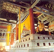 Inside the main hall is a three-story wooden altar with steps linking its upper and lower sections. In the northwest part of the compound stands the Hall of a Thousand Buddhas, with a spiral staircase a finely carved Buddha image less than one foot high, cover the walls.