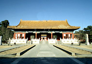 Compared to the other 12 tombs the Changling is the largest and best preserved. Built on a south-facing slope, the Changling? s three courtyards are entirely surrounded by walls. The first courtyard extends from the massive three-arched entrance gate to the Gate of Eminent Favor (Long? enmen); on the east of this courtyard stands a pavilion, which contains a stone tablet, a stone camel and a stone dragon. Inside the second courtyard stands the Hall of Eminent Favor. The central portion of the stairway, which leads up to this great hall is carved with designs of sea beats and dragons. To the east and west of the hall stand two ritual stoves where bolts of silk and inscribed scrolls were set aflame as offerings to the emperor?s ancestors. The dimensions of the Hall of Eminent Favor (67 x 29 meters) closely match the dimensions of the Hall of Supreme Harmony (Taihedian) in the Forbidden City, which makes it one of the largest wooden buildings in China. Four giant wooden columns and 28 smaller pillars support this structure, The four large columns are 14.3 meters high and 1.17 meters in diameter, and are extraordinary for the fact that they are each a single trunk of Phoebe nanmu.