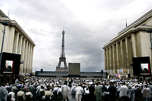 Thousands of veteran WWII soldiers and victims gathered in Paris to commemorate 60th anniversary of the liberation of the Nazi death camps in Paris, Sunday. (Xinhua/AFP Photo)