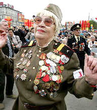 A Russian World War Two veteran dances during a procession in central Moscow, May 8, 2005. Russia will mark the 60th anniversary of the former Soviet Union's victory over Nazi Germany in World War Two on May 9. (Xinhua/Reuters Photo)