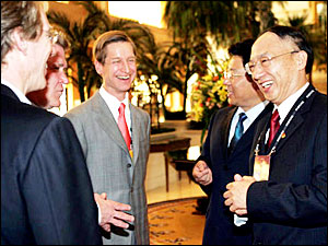 Liu Peng, director of the General Administration of Sport of China, talks with President John Squires of Sports Illustrated.