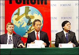 President and CEO Yang Yuanqing of Lenovo Group, Sony CEO Nobuyuki Idei and Wal-Mart CEO John B. Menzer at a press conference.