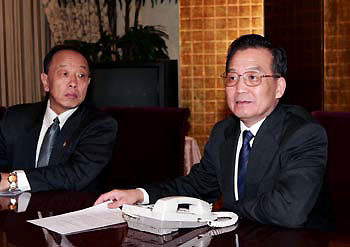 | Chinese Premier Wen Jiabao (R) gives a call to the members of the Chinese rescue team on Jan. 5 in Banda Aceh, saying the earthquake-triggered tsunami is a catastrophe for all mankind and the tsunami rescuers should continue to work hard. A 35-member Chinese search and rescue team began treating tsunami survivors and preventing disease as soon as it arrived on Dec.31, 2004 in Banda Aceh, the capital of Aceh that was devastated by the tsunamis. |