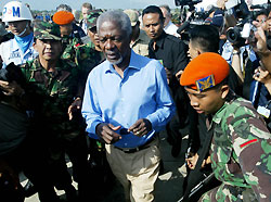 U.N. Secretary-General Kofi Annan is escorted by Indonesian soldiers as he arrives at an airport in the tsunami-hit city of Banda Aceh on the Indonesian island of Sumatra January 7, 2005.