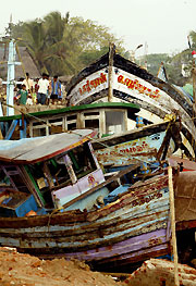 Tsunami survivors pass damaged fishing boats in Nagapattinam, 350 km (219 miles) south of the Indian city of Madras January 7, 2005.