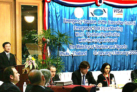 | Thai Prime Minister Thaksin Shinawatra addresses the emergency session of UN World Tourism Organization's executive council Emergency Task Force Meeting in Phuket of Thailand, Feb. 1, 2005. Representatives from more than 40 countries and regions as well as organizations attended the WTO Executive Council's one-day emergency meeting. |