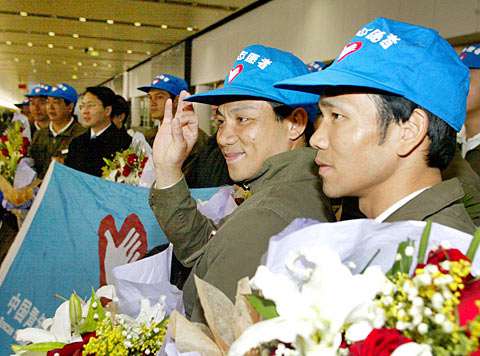| A team of 18 young Chinese volunteers is welcomed at Beijing Capital International Airport upon arrival from Thailand March 8, 2005. They had worked in tsunami-striken areas in Thailand, salvaging sunken boats and retrieving debris deposited on the seabed. |
