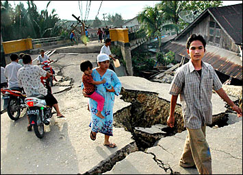 | Residents pass by collapsed buildings in Gunung Sitoli on Nias Island March 30, 2005, following the 8.7 magnitude tremor that hit shortly before midnight two days ago. UN Secretary General Kofi Annan March 29 voiced distress and pledged UN support following the huge earthquake off Indonesia that rescuers estimate may have claimed more than 1,000 lives. |