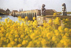 The Baodai Bridge is also a vital communication line between the north and the south. It is seated on the Daidai River running between the Grand Canal and the Dantai Lake. The faraway undulating mountains, vast fields, and the waters nearby, all form an integral whole exhibiting picturesque scenery that has been eulogized by poets of different times. Following are the lines by Lu Shiyi of the Qing Dynasty: