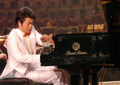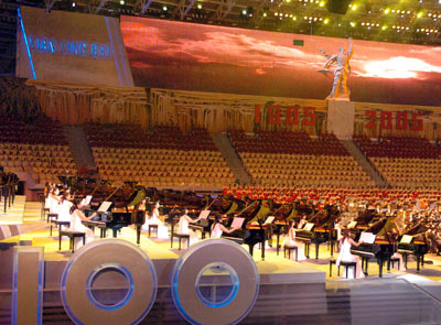A concert of Xian Xinghai's works is held in Guangzhou June 12, 2005 to mark the musician's centennial birth anniversary and the 60th anniversary of the victory of the War of Resistance Against Japanese Aggression (1937-1945). Led by pianist Lang Lang, 100 girls dressed in white played Xian's Yellow River Cantata, a household song composed in 1939 that inspired the Chinese people to fight against Japanese aggression. (Xinhua photos)