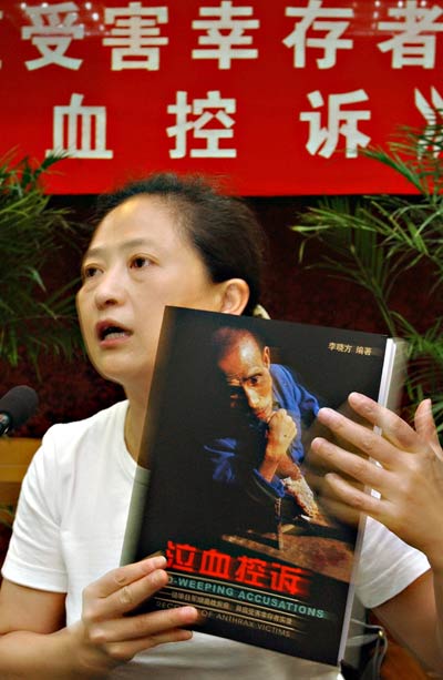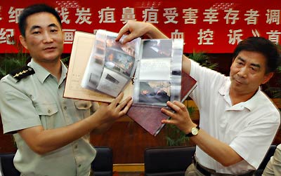 The inaugural ceremony is held in Hangzhou, capital of east China's Zhejiang Province, June 15, 2005, for launching the publication of Blood-weeping Accusations, a documentary picture album revealing for the first time the living conditions of the survivors from Japan's anthrax and glanders attacks during its aggression against China. Since 2001, Li Xiaofang from Hangzhou Sanatorium of the Nanjing Military Command of the People's Liberation Army interviewed more than 200 survivors living in Zhejiang and Jiangxi, and compiled the album composed of over 200 photos, the survivors' account of their wartime experiences, and investigation reports by Chinese and foreign experts. (Xinhua photos)