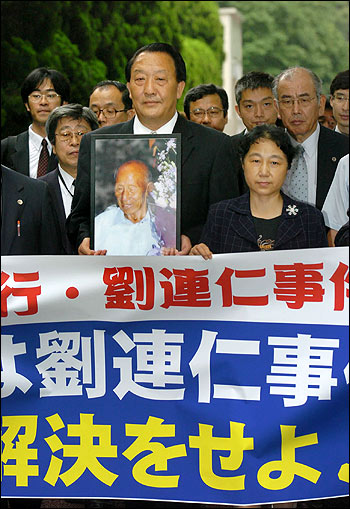 Liu Huanxin, son of late Chinese forced laborer in Japan Liu Lianren, holds his father's photo to protest against the Tokyo High Court's verdict in Tokyo June 23, 2005. The Tokyo High Court on Thursday denied compensation to the family of Liu Lianren who escaped from a work site toward the close of World War II and hid in mountains for about 13 years unaware the war had ended. (Xinhua photos)