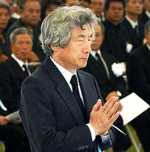 Japanese Prime Minister Junichiro Koizumi folds his hands in prayer for the victims of the WWII Battle of Okinawa at a memorial ceremony marking the 60th anniversary of the battle in Itoman, on the southern Japanese island of Okinawa, June 23, 2005. Sixty years after the war's last great land battle left some 200,000 dead, survivors worry that lessons of the horrors of the war are fading. (China Daily/Reuters Photo)