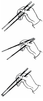 The correct way of using the chopsticks requires concerted efforts of the thumb, index finger, middle finger and third finger. Hold the pair of chopsticks in the right hand, using the index finger, middle and third fingers to keep the chopsticks steady near their top and then push them open by moving the thumb and index finger.