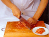 The thickness of shreds usually varies between 0.2 (0?0.8 in) and 0.4(0?1.6 in). First, either chunks of meat or vegetables are cut into thin slices of 0.2 to 0.4 cm in thickness. The slices are then arranged neatly like roof tiles. Pressed steadily underneath the left and of the chef, the slices are finally cut into shreds.