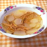 (2) Put 750 grams (1.5 cups) of water in a pot, put in the wax gourd, bamboo shoots, salt and cooking wine and bring liquid to a boil. Switch to low fire and cook for 15 minutes. Add MSG and sprinkly sesame oil and serve.