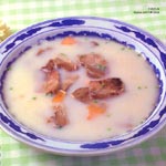2. Wash the mutton clean. Put it into a pot together with the fish bone soup. Let this boil over a strong fire and then add the horse radish, scallions, ginger, leek, and cooking wine and turn down to a low fire to cook for 1 hour or until the mutton and horse radish are well done. Add the salt and MSG. Cook another 5 minutes, sprinkle the pepper powder and the soup is ready to serve.