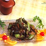 Ingredients: 750 grams (1.65 lb) eggplants 25 grams (5/6 oz) red chili 500 grams (1 cup) salad oil (only 1/5 to be consumed) 10 grams (2 tsp) mixture of cornstarch and water 50 grams (2 2/3 tbsp) soy sauce 2 grams (1/2) MSG 1/2 gram (1/12 tsp) salt 2 grams (1/15 oz) scallions 2 grams (1/15 oz) ginger 2 grams (1/15 oz) garlic 100 grams (6 tbsp) water 5 grams (1 tsp) cooking wine 2 1/2 grams (1/2 tsp) soy bean paste 10 grams (2 tsp) sesame oil 15 grams (1 tbsp) vinegar