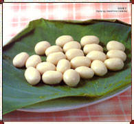 1. Put 50 g (3 tbsp) of water in the pot, put in the sugar and heat on low fire till the mixture becomes slightly sticky. Add the sweetened osmanthus sauce and mint flavoring and well stir. Place the mixture on the chopping board. And before it turns cold and becomes solid, shaped it into a long strip and cut into squares 1 cm (0.4 inch) each side.