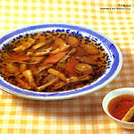 Ingredients: 250 grams (5/9 lb) fresh abalone 100 grams (2/9 lb) asparagus 50 grams (1/9 lb) ham 150 grams (1/3 lb) chicken breast slices 20 grams (4 tsp) cooking wine 5 grams (5/6 tsp) salt 2 grams (1/2 tsp) MSG 5 grams (1/6 oz) sectioned scallions 5 grams (1/6 oz) sliced ginger