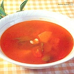 Peal the potatoes and carrots, and remove the seeds of the cucumbers. Cut the cabbage, mushrooms and tomatoes into slices. Heat the oil in a wok. Put in the ketchup and fry it till there is red oil. Add the vegetables and 750 grams (1.5 cups) of water, bring it to boil over strong fire. Then turn the fire to low and let it simmer for 5-6 minutes until the potatoes are soft. Add the salt, MSG and sugar and pour out into the soup bowl to serve.