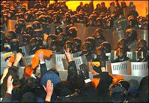 During the day, Yushchenko supporters followed their candidate to a special session of parliament, waving orange flags and chanting "Criminals go away!" As night fell, more than 10,000 marched to the presidential administration building, skirting some heavy trucks that blocked the street and facing off with hundreds of police in full riot gear who were guarding the site.
