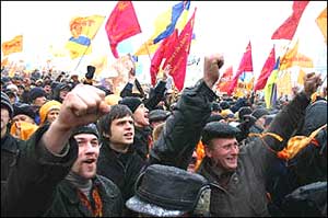 In Donetsk, a big coal-mining center, slogans were pinned to fences denouncing Yushchenko as a traitor. Protests supporting Yanukovych were being held in pits and factories. Miners were trying to get to Kiev to counter opposition rallies.