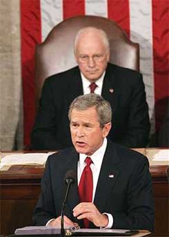 Bush spoke from the rostrum of the House chamber, with Vice President Dick Cheney and House Speaker Dennis Hastert seated behind him. More than two dozen guests were invited to sit in the first lady's box with Laura Bush, including relatives of fallen US troops, a pilot helping tsunami victims and individuals whose presence were meant to underscore Bush's domestic agenda, such as education, social security medical malpractice and other areas.