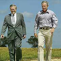 "Would you like to explain why you're wearing a suit," Bush, in cowboy boots, teased his defense secretary.