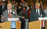 Director of the International Atomic Energy Agency (IAEA) Mohamed El Baradei, chief UN inspector Hans Blix, and head of the Iraqi delegation Amir Al Sadi announce it when addressing the media in the Vienna International Center on Tuesday October 1, 2002.
