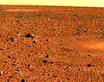 The photograph -- actually a mosaic of a dozen three-color frames shot by Spirit's twin panoramic cameras -- showed a barren, burnt-orange landscape strewn with blue-grey rocks stretching to the edge of a butterscotch horizon.