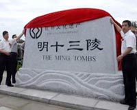 A 2.4-meter-tall statue, commemorating the listing and made of a whole huge piece of boulder, was erected at the gate, with six Chinese characters on its front, reading World Heritage Site, and the introduction of the Ming tombs on the back.
