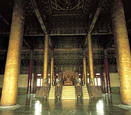 The building arrangement within the Forbidden City is symmetrical. The Hall of Supreme Harmony, the Hall of Central Harmony and the Hall of Preserving Harmony, which comprise the outer palace, and the Hall of Heavenly Purity, the Hall of Union and the Hall of Earthly Tranquility, comprising the inner palace, stand in a line from south to north on the central axis. The 8 km central axis runs through the entire old Beijing city to Yongdingmen in the south and Zhonggulou in the north. The throne symbolizing imperial power is positioned at the center of this central axis.