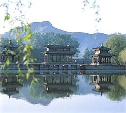 The Mountain Resort, located in Chengde City, Hebei Province, covers an area of 564 square meters, almost half of Chengde's urban area. It is enclosed by a wall 10,400 meters long. Construction began in 1703 under the rule of Emperor Kang Xi and was completed in 1790 under the rule of Emperor Qian Long. There are more than 100 buildings within the resort, which is divided into two sections: palace zone and garden zone. The Rehe (Jehol), the shortest river in the world, only 14.7 kilometers long, runs through the resort. The gardens are superbly designed to take in the very best of various styled gardens.