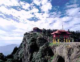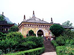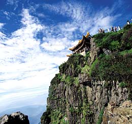 Mount Emei is called the “mountain of brightness” in Buddhism. The legend goes that the Guangxiang Temple on the mountain top was where the goddess of benevolence performed Buddhist rituals, thus making it one of the four famous sacred mountains of Buddhism in China. There used to be over 100 temples and halls on the mountain, but only some 20 still stand. The Baoguo Temple situated at the foot of the mountain is the largest temple on Mount Emei, built during the Ming Dynasty (1368-1644). The red copper Huayan Pagoda inside the temple is an important relic for studying Chinese Buddhism. The 14-storyed pagoda is seven meters high and its walls are engraved with more than 4,700 images of Buddha and the full text of the Buddhist Sutra of the Huayan Sect.