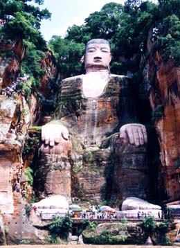 The Giant Buddha of Leshan is carved on Lingyun Hill, east of Leshan City, which is not far away from Mount Emei. The solemn Buddha is 71 meters high and its head itself is 14.7 meters high. Its ear is 6.2 meters long, eye 3.3 meters wide, and shoulder 34 meters wide. Its head is covered with 1,021 chignons. Its middle finger is 8.3 meters long, and each of the feet are 11 meters long and 8.5 meters wide, large enough to accommodate more than 100 people sitting on it. The huge figure sits with his hands resting on his knees, his head reaching the hilltop and his feet the river, occupying the entire hillside.