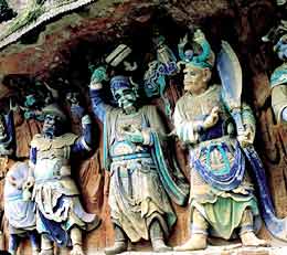 Construction began on the Beishan Hill in the late Tang Dynasty and lasted for more than 250 years, with some 300 niches containing some 10,000 statues of Buddha being carved. The cave bearing the openwork octagonal "soul chariot" which symbolizes the eternal turning of the wheel of Buddhist law is the most fantastic piece of work. Right in the center of the cave is the statue of Sakyamuni, founder of Buddhism, which is flanked by more than 20 statues including the Buddha of wisdom and universal benevolence.