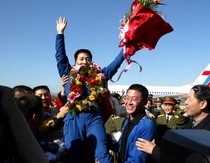 After a physical exam on spot, Yang Liwei's condition was found as "good." He flew to Beijing less than two hours after landing as space fever spread and thousands gathered at Beijing's Millennium Monument for a celebration.