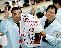 People Make 'Victory' Gestures at Beijing Launch Control Center