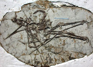 Pterosaur first originated at late Trias about 200 million years ago. Being the most peculiar type of reptile, pterosaur was first vertebrate that flew in the sky. The fossil of the "Jida pterosaur" is discovered in the stratum of Early Cretaceous Jiufotang Formtion at Chaoyang, Liaoning Province. The "Jida pterosaur" on display is almost a complete skeleton with a nearly intact cranium. The wingspan of the pterosaur measures 1.6 meters. The new discovery is of paramount importance for research of classification, evolution and distribution of pterosaur.