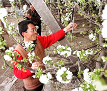 Farmer Li Shengchun works inside his greenhouse full of blossom cherry trees in Qingzhou, east China's Shandong Province, Mar. 8, 2003. He will sell the cherry fruits in April. Local peasants here have benefited a lot by widely adopting the greenhouses and the new planting methods.