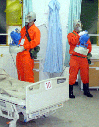 Two workers disinfect a ward at the Sino-Japanese Friendship Hospital in Beijing July 15, 2003. A SARS-designated hospital during the outbreak period, it was ready to receive ordinary patients July 20 after no new SARS (severe acute respiratory syndrome)cases were reported in the country for three weeks.