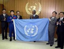 Chinese Ambassador to the UN Wang Guangya said the Chinese astronaut came all the way from China to give Annan the UN flags, which demonstrated the support of Chinese people for the UN.