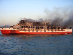 It was nearing its destination when fire broke out. Salvage ships towed the stricken ship to a safe area near the harbor and fire fighters continued efforts to extinguish the blaze last night.