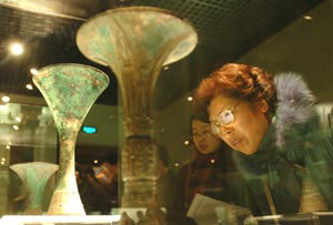 A local resident views an ancient wine container dating back to ancient China's Shang Dynasty (1,600 BC-1,100 BC) in the newly-built Shanxi Museum in Taiyuan, capital of north China's Shanxi Province, Jan. 8, 2005.