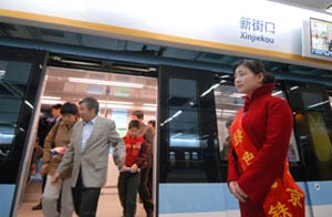 A Nanjing metro stewardess dressed in red guides passengers boarding the metro.