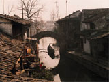 Behind the street is a river that winds through the city. It is spanned by six stone arch bridges, and on the water you can find many dark-awning boats, a common scene in the city of Shaoxing which is crisscrossed by numerous rivers.